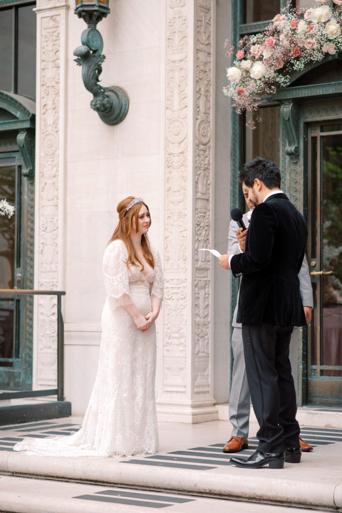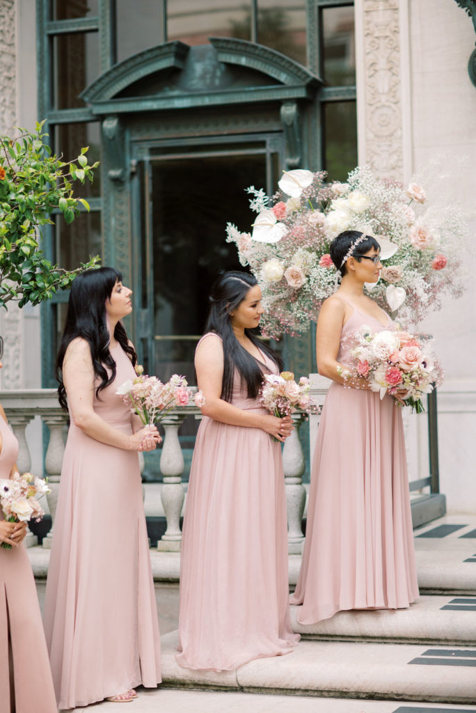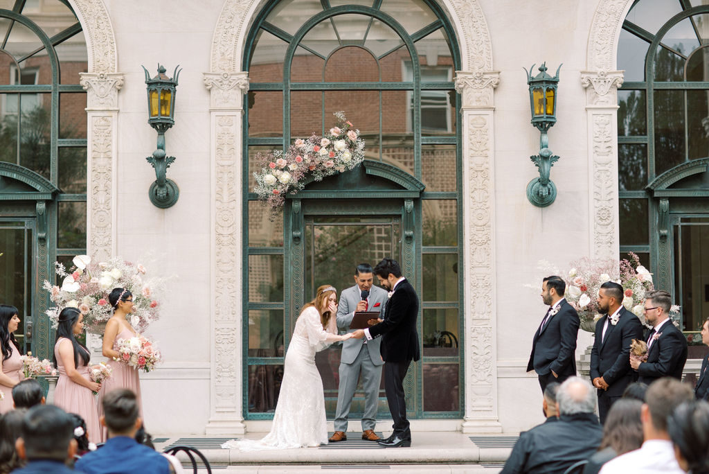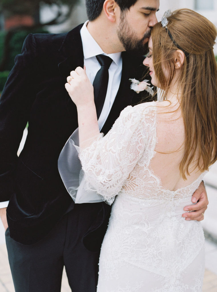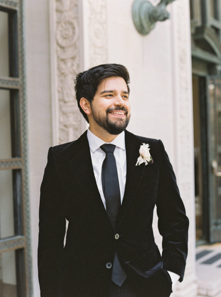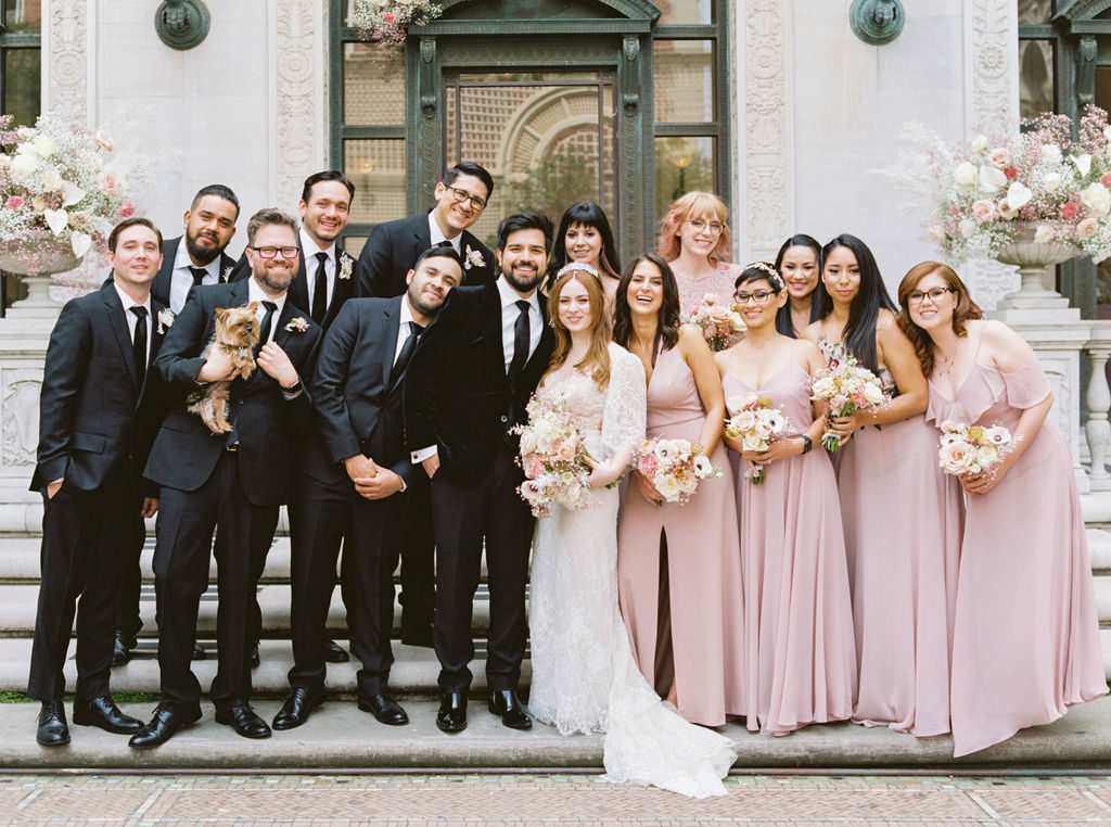 From the couples old world, European taste reflected in the beautiful Flood Mansion venue, Jessica’s vintage inspired Liz Martinez gown, Jesse’s vintage YSL velvet coat, crystal cut glassware, to the modern colors and clean lines and magical elements through florals, cosmic water tumblers, Jessica’s quartz crown and tarot card placecards and inspired wedding day stationery – this was a favorite to design and so rewarding to see it all come together! Each element was hand selected and had sincere thought behind it.